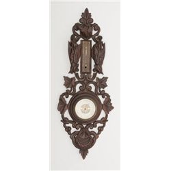 Antique thermometer and barometer mounted together with fancy carved wood frame showing hunting dog