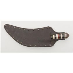 North Africa to Morocco style curved dagger with graduated hilt showing various colored bone pieces and composite materials layered to form grip.