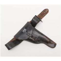 Cast metal model in style of Mauser broom handle with leather holster and belt showing a decal of