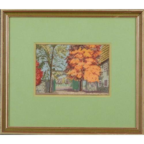 This is a vibrantly colored and meticulously created embroidery. It is an outstanding example of skill and creativity. The bright yellows and oranges of autumn pulsate against the cool grays of the house and blues of the sky. This embroidery is exquisitely matted in a green, light green, and gold triple mat that gives great dimension to the image, and framed in a sleek gold wood frame that accents the warm hues of the stitching. The entire piece measures 11.75? x 13.25?.