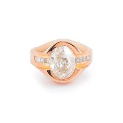Centrally set with an oval-faceted diamond, weighing approximately 4.46 carats, with an estimated J-K color and I1-I2 clarity, flanked with 8 princess