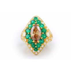 Featuring a central marquise-cut diamond, weighing approximately 2 carats, of lower color, surrounded by approximately0.7 carats of round-cut diamonds