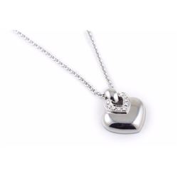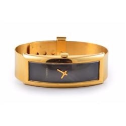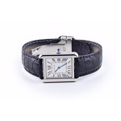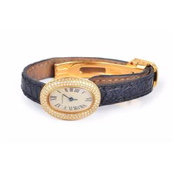 Platinum case set with approximately 1 carats of diamonds. Face, including decoration, measures 1 1/8 x 5/8 inch. Crown is accented with a sapphire of