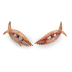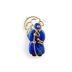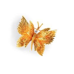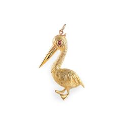 Designed as a pin in the shape of a bee, with ruby eyes and two dog tooth pearl wings; signed Ruser 14K; measures 1-1/4x 1 inches; weight 9.8g.