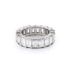 A platinum eternity band with 19 emerald-cut diamonds weighing a total of approximately 7.22 carats. Diamond quality F/G/H color, VS/SI clarity. Ring