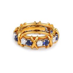 Comprised of a double row of diamonds supporting five oval sapphires of excellent color surrounded by diamonds, set in 18K gold. Total diamond weight