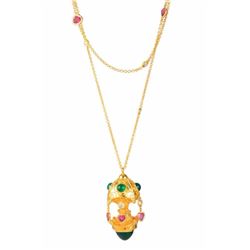 Suspending one central emerald, weighing approximately 5 carats, surrounded by numerous small diamonds, mounted in 18K yellow gold; within the chain a