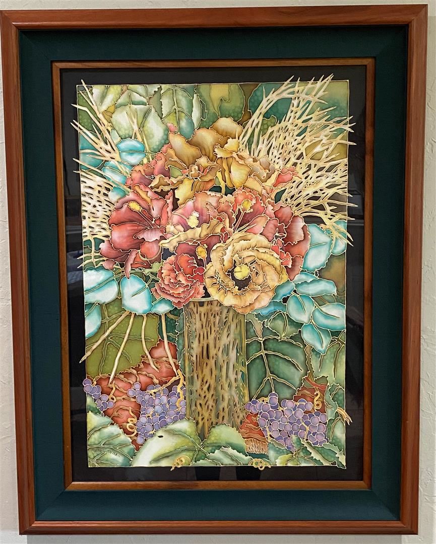 Beautifully framed in KOA wood this is the original 24x33" "Fall Flowers" on silk by Hawaiian artist Susan Patricia. It measures 40x31 framed