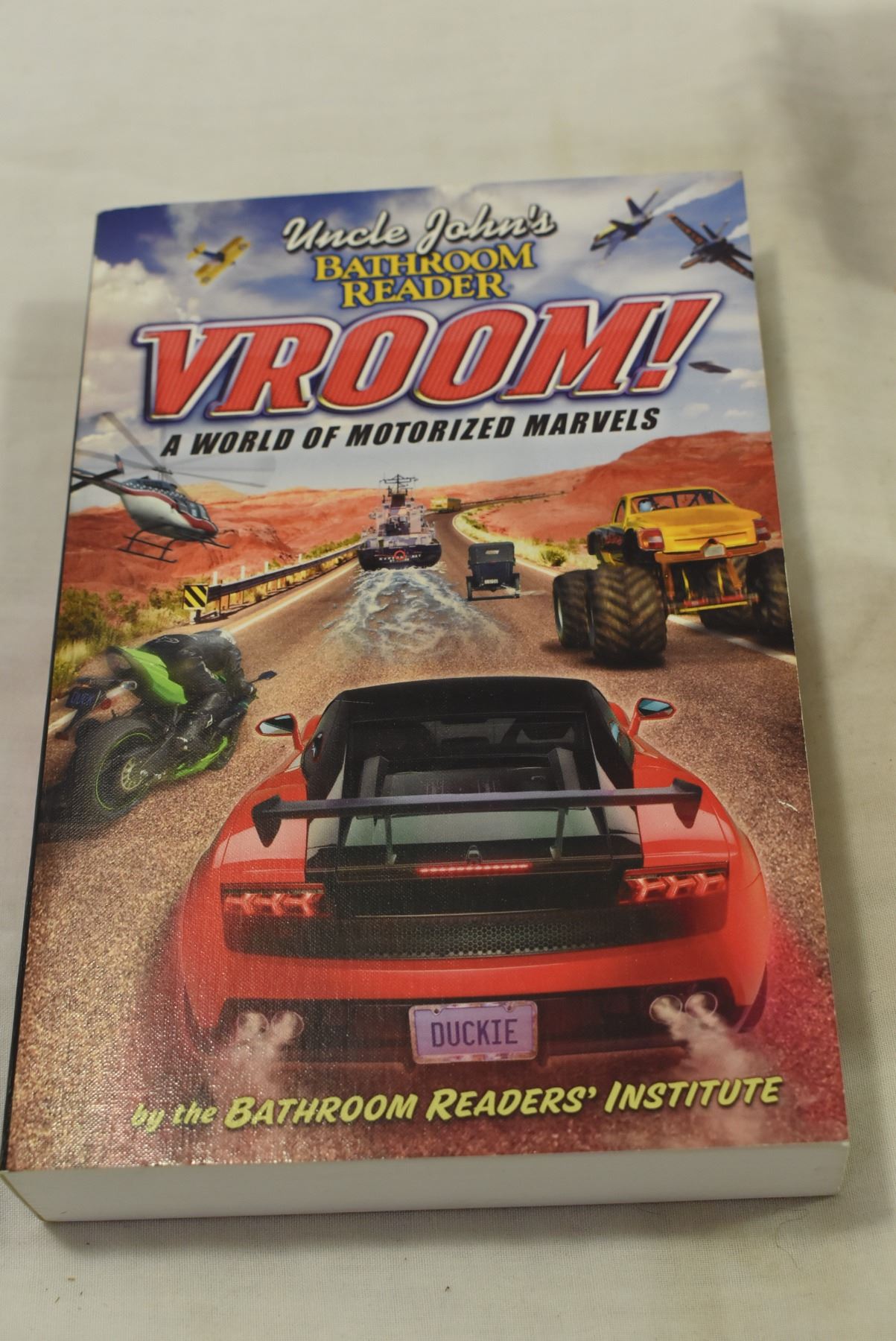 Fall Guy Truck, Fish hooks, box of pens, Vroom! Bathroom reader Book