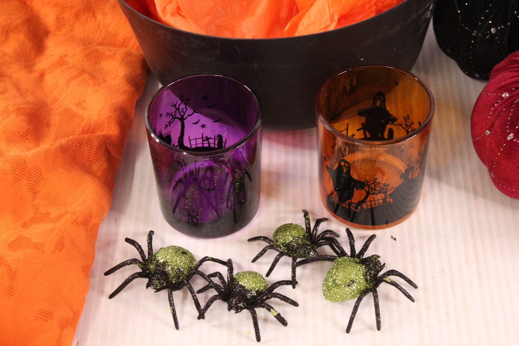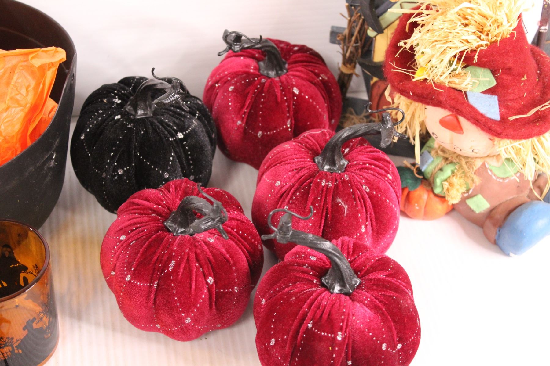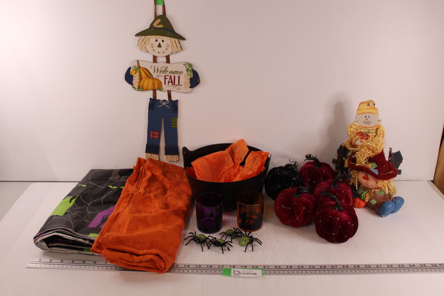 Fall & Halloween Lot: Tablecloths, Pumpkins, Spiders, Scarecrows, Misc.