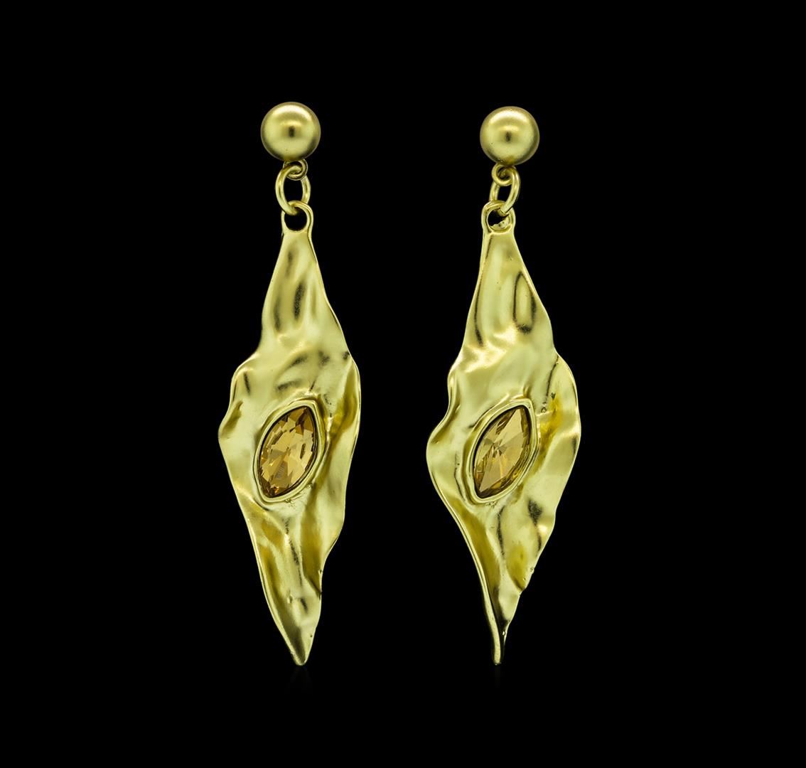 High end designer jewelry. Fall Leaf Crystal Earrings - Gold Plated. Gold Plated Metal/2.25" Dangle. Gold/ Citrine. Post. Total Weight: 7.8 grams.