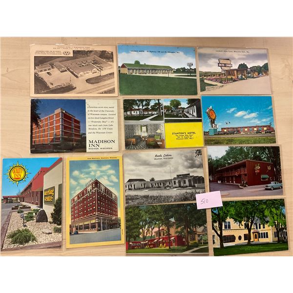 Over 65 Wisconsin postcards. Many hotels, motels, roadside, etc. Linen to chrome.