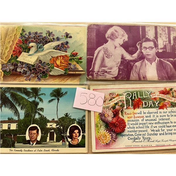 A box of mix topics. Approx. 250 YMCA, 60+ Rally Day, 25 or so arcades, 70+ mixed topics, a bunch Hollywood, 40+ nice continentals and 1 antique Hallo