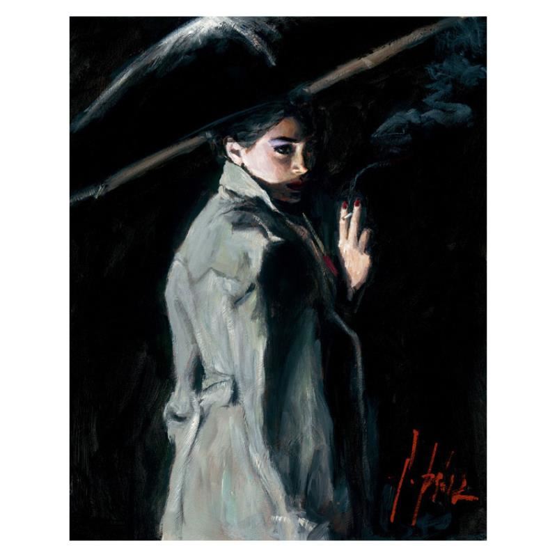 "Fall Night" is a hand embellished limited edition giclee on stretched canvas by Fabian Perez. The piece is numbered and hand signed by the artist and comes with a Certificate of Authenticity. Measures approx. 18" x 14" (image). Please allow 5 additional business for items that include canvas stretch or framing.