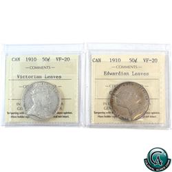 50-cent 1910 Edwardian Leaves & Victorian Leaves ICCS Certified VF-20. 2pcs.
