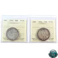 50-cent 1912 F-15 & 1914 F-12 ICCS Certified. A nice pair of even, medium tone coins. 2pcs.