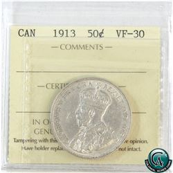 50-cent 1913 ICCS Certified VF-30. A bright coin with soft mint luster.