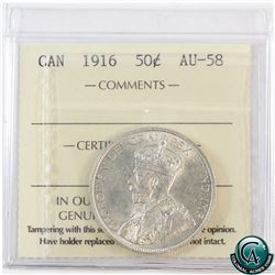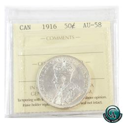 50-cent 1916 ICCS Certified AU-58. A bright semi key date coin with hints of golden toning and mint luster.