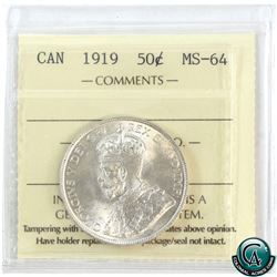 50-cent 1919 ICCS Certified MS-64. A bright lustrous coin with strong strike details.877 - 50-cent 1919 ICCS Certified MS-64. A bright lustrous coin with strong strike details.