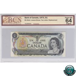 1343 - BC-46aA 1973 Bank of Canada $1, Lawson-Bouey, Two Letter, Replacement, *GL3559444, BCS CUNC-64 OrigiColonial Acres Coins Ltd.