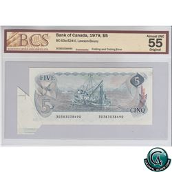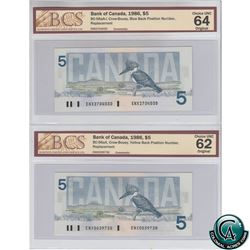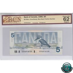 BC-56a-i 1986 Bank of Canada $5, Changeover, Crow-Bouey, S/N: EOH6918105 BCS Certified CUNC-62 Original.