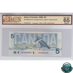 BC-56cA 1986 Bank of Canada Replacement $5, Bonin-Thiessen, S/N: FNX8287786 PMG Certified Gem UNC-66