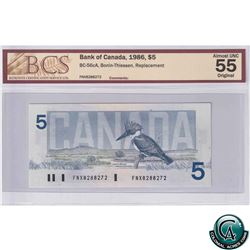BC-56cA 1986 Bank of Canada $5, Bonin-Thiessen, Replacement, S/N: FNX8288272 BCS AU-55 Original.