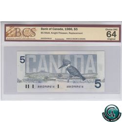 BC-56dA 1986 Bank of Canada Replacement $5, Knight-Thiessen, S/N: ANH3949616 BCS Certified CUNC-64 Original. ANH (3.56-3.69M)