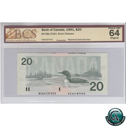 BC-58b-i-E18-i 1991 Bank of Canada $20, Misplaced Serial Number Error. Bonin-Thiessen, S/N: ASA6197333 BCS Certified CUNC-64 Original!