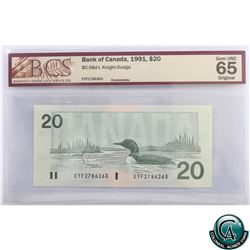 BC-58d-i 1991 Bank of Canada $20. Knight-Dodge S/N: EYF2786263, BCS Certified Gem UNC-65 Original.