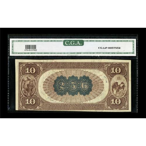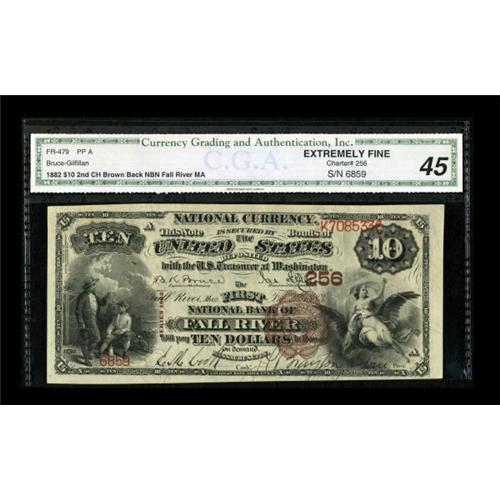 <B>Fall River, MA</B></I> - $10 1882 Brown Back Fr. 479 <B>The First NB</B></I> Ch. # 256<BR> Broad margins frame this colorful issue. In 2006 a well worn Brown Back from this issuer appeared at public auction, and 2001 before that. <B>CGA</B></I> <B>Extremely Fine 45.</B></I><BR><BR><b>Shipping:</b> Coins & Currency (<a target="_blank" href="http://www.heritageauctions.com/common/shipping.php">view shipping information</a>)