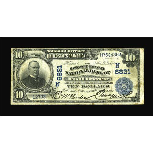 <B>Fall River, MA</B></I> - $10 1902 Plain Back Fr. 624 <B>The Massasoit-Pocasset NB</B></I> Ch. # (N)6821<BR>This bright <B>Very Good</B></I> example exhibits the usual circulation with a touch of soiling more prevalent on the back.<BR><BR><b>Shipping:</b> Coins & Currency (<a target="_blank" href="http://www.heritageauctions.com/common/shipping.php">view shipping information</a>)