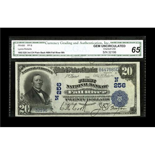 <B>Fall River, MA</B></I> - $20 1902 Plain Back Fr. 650 <B>The First NB</B></I> Ch. # 256<BR>This note, which has garnered the grade of <B>Gem Uncirculated 65</B></I> from CGA, comes from a small known hoard of CU notes off this bank.