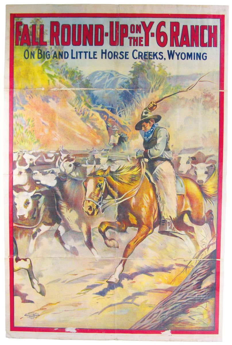 "Fall Round-Up on the Y-6 Ranch" Poster. Depicting cowboys breaking a horse on the Big and Little Horse Creeks in Wyoming. Vertical and horizontal folds otherwise good original condition. 27 X 41 inches.