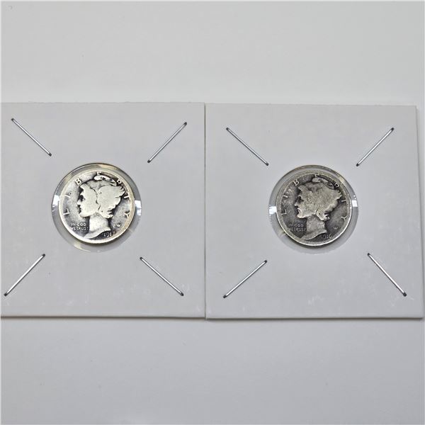 Pair of Mercury Dimes. Both appear to be Philidelphia coins, (1) 1916 and (1) 1917. 90% silver, circulated and look to be in good condition overall....