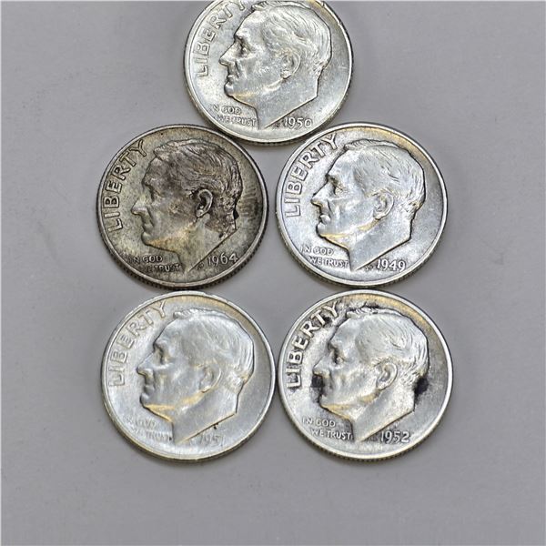 Lot of (5) 90% silver Roosevelt dimes. All look to be in fine condition, including P1949, S1950, S1951, S1952 and D1964