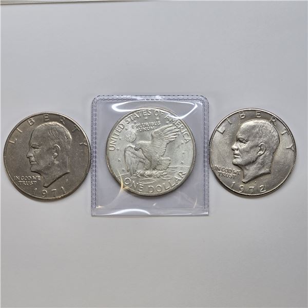 Lot of three Eisenhower dollars (1) San Francisco 1971 collector silver Eisenhower dollar shows some minimal wear, (1) Philidelphia 1971 Eisenhower cl