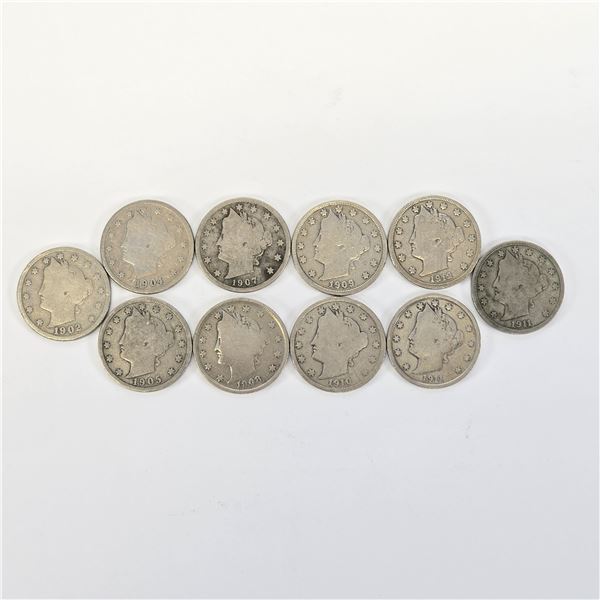 Lot of ten Barber Liberty Head "V" nickels. all look to be in good condition, some with reverse in fine to very fine. Half of the lot look...