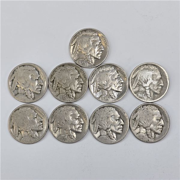 Lot of nine Buffalo Nickels. Circulated with conditions ranging from good to very fine with two looking to have been cleaned. Dates ranging from 1916
