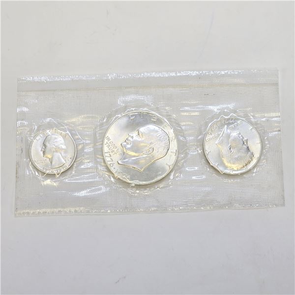 Silver Collector Bicentennial 1776-1976 Proof Coin Set Including a Washington Quarter, Kennedy Half Dollar, and Eisenhower Dollar. All seem to be unci