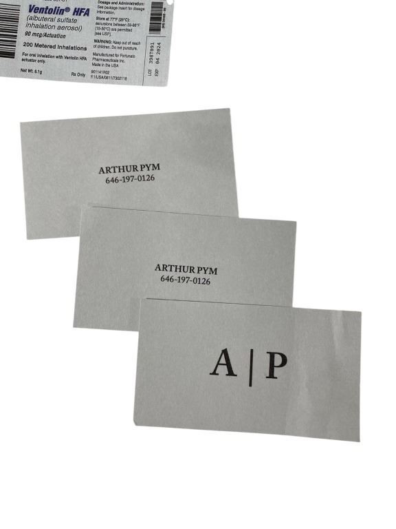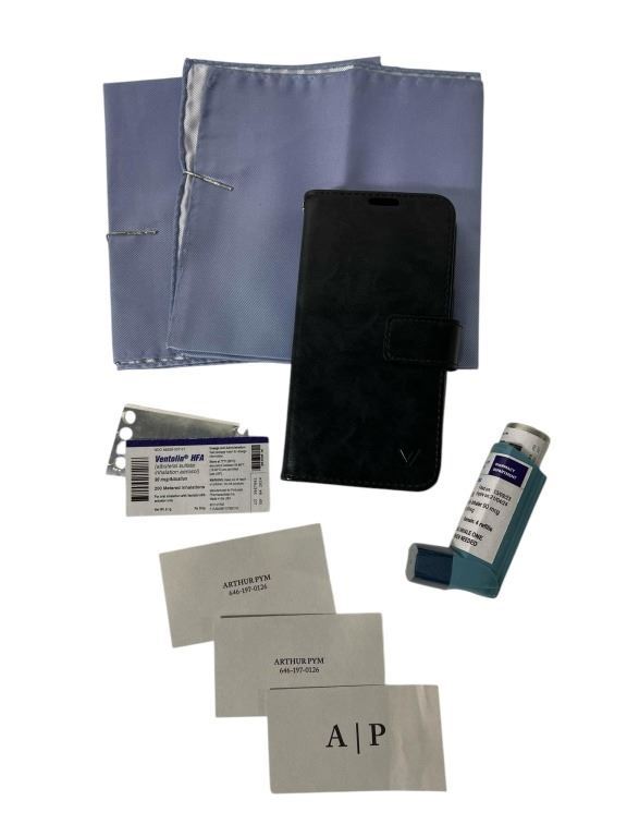 Props include his screen used inhaler, phone case, business cards, prescription labels and hanky.