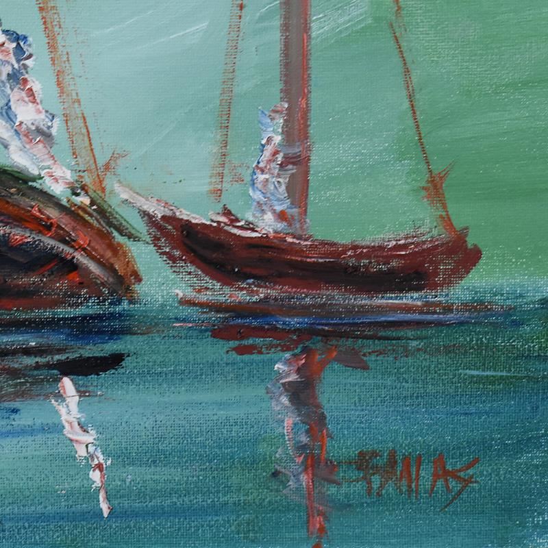 "Trio of Boats" is an original oil painting on stretched canvas by Elliot Fallas, hand signed by the artist. Includes Letter of Authenticity. Measures approx. 16" x 20" (image). The sides of the canvas are painted and it can be hung as is, but a frame is definitely recommended.