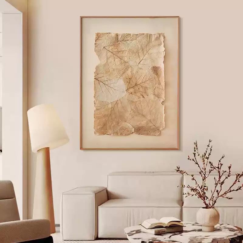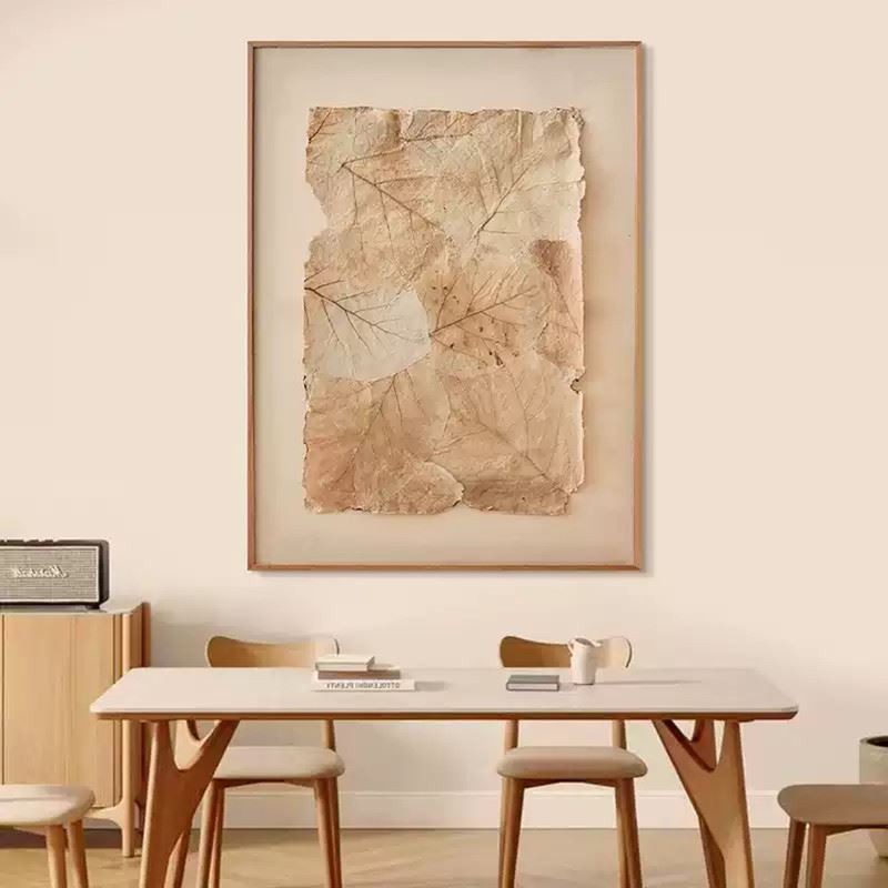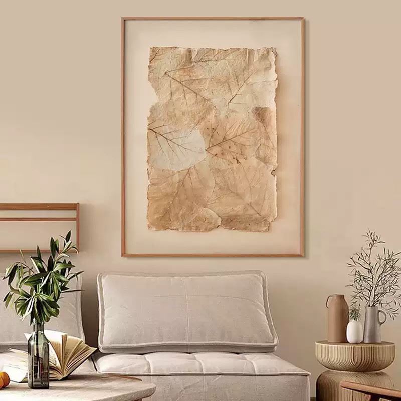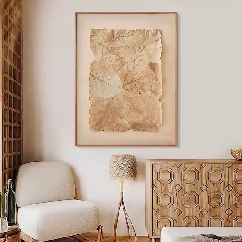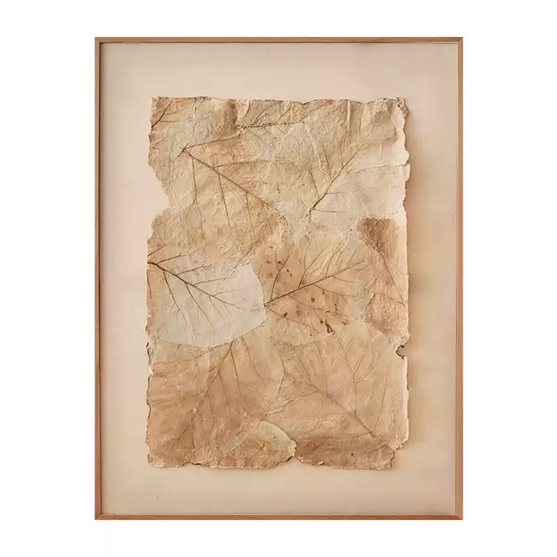 This artwork uses dry leaves and soft tones to convey the cycle of life and a sense of belonging. Each leaf seems to tell a story of nature, with warm colors and textures paying silent homage to the natural world. Dimensions: 24 x 31 inches.