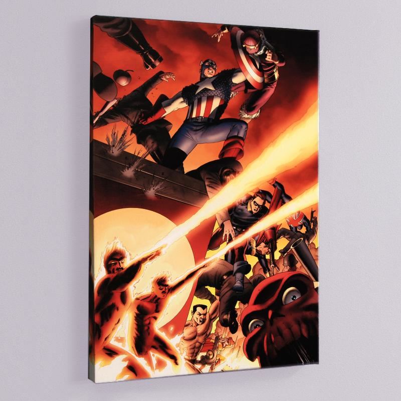 A piece of comic book history, this limited edition, from original art by John Cassaday, depicts Captain America and Bucky. In 1997, shortly after his entrance into the world of comic book art, John Cassaday began to work Marvel Comics, working primarily on X-Men/Alpha Flight. He has also worked on Captain America, Secret War, and Union Jack. "Fallen Son: Death of Captain America #5" is a limited edition numbered giclee on stretched canvas by John Cassaday presented by Marvel Comics. This piece is gallery wrapped and ready to hang. Includes Certificate of Authenticity! Measure approx. 18" x 27" (image); 1.5" (depth).