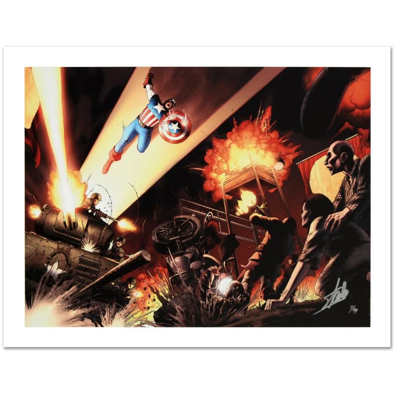 A piece of comic book history, this limited edition, from original art by John Cassaday, depicts a heroic Captain America. In 1997, shortly after his entrance into the world of comic book art, John Cassaday began to work Marvel Comics, working primarily on X-Men/Alpha Flight. He has also worked on Captain America, Secret War, and Union Jack. "Fallen Son: Death of Captain America #5" is a numbered limited edition giclee on canvas by John Cassaday presented by Marvel Comics, hand signed by the great Stan Lee! Includes Certificate of Authenticity! Measures approx. 24" x 18" (image).