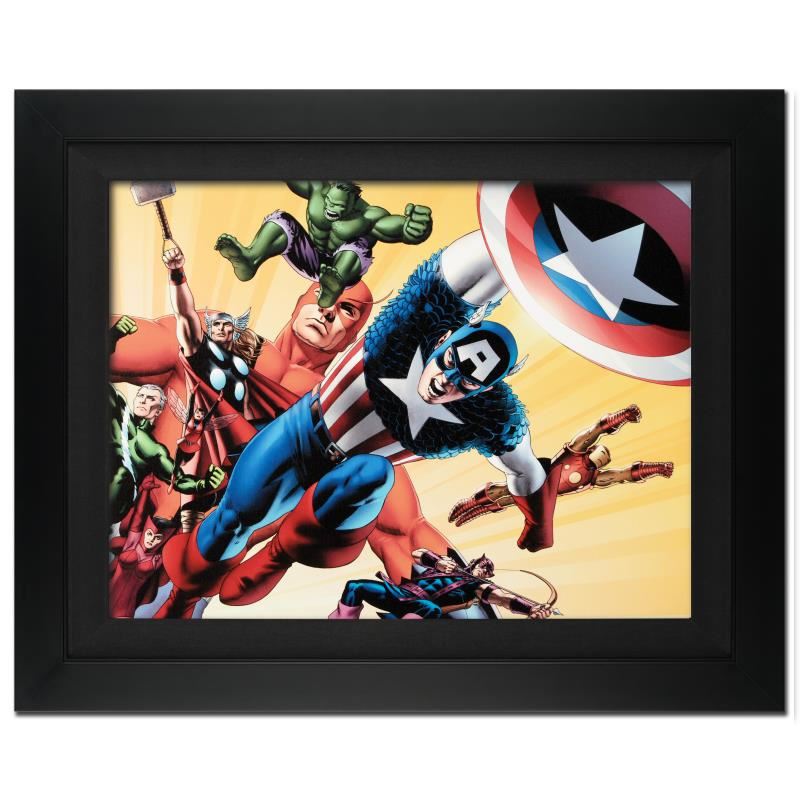 A piece of comic book history, this limited edition, from original art by John Cassaday, depicts a heroic Captain America. In 1997, shortly after his entrance into the world of comic book art, John Cassaday began to work Marvel Comics, working primarily on X-Men/Alpha Flight. He has also worked on Captain America, Secret War, and Union Jack. "Fallen Son: Death of Captain America #5" is a limited edition giclee on canvas by John Cassaday presented by Marvel Comics, hand signed by the great Stan Lee and numbered out of only 4! This piece has been custom framed and ready to hang. Includes Certificate of Authenticity! Measures approx. 36" x 29" (with frame); 28.5" x 21.5" (image).