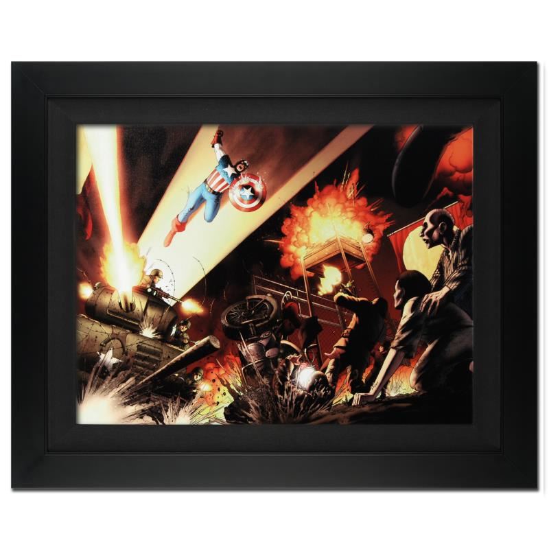 A piece of comic book history, this limited edition, from original art by John Cassaday, depicts a heroic Captain America in action. In 1997, shortly after his entrance into the world of comic book art, John Cassaday began to work Marvel Comics, working primarily on X-Men/Alpha Flight. He has also worked on Captain America, Secret War, and Union Jack. "Fallen Son: Death of Captain America #5" is an extremely limited edition giclee on canvas by John Cassaday presented by Marvel Comics, hand signed by the great Stan Lee and numbered out of only 10! This piece comes custom framed and ready to hang. Includes Certificate of Authenticity! Measures approx. 31" x 25" (with frame), 24" x 18" (image).