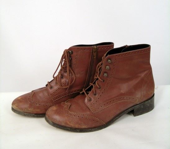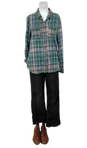 Episode 506 - Alicia (Chelah Horsdal) screen worn, green, blue, navy, and white plaid long sleeve button front 'Mossimo Supply Co.' shirt, tobacco print stamped leather 'Lucky Brand' belt, dark blue denim 'Riders by Lee' jeans, and tobacco lace up the front with side zipper 'Long Tall Sally' ankle boots. Includes wardrobe tag.