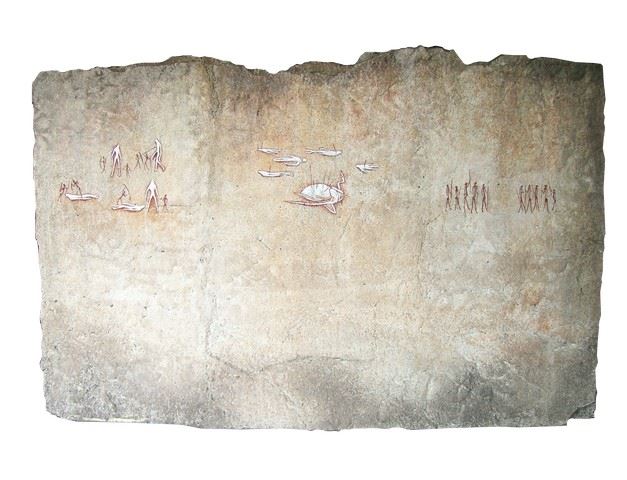 Large wall with alien hieroglyphics, resembles a cave wall. Images of Espheni Overloads hunting and shepherding humans, fallen humans and Espheni Hornets strewn across the battlefield, and two tribes with spears. Tan color, hard foam with wood frame. Approx. 148" x 88".