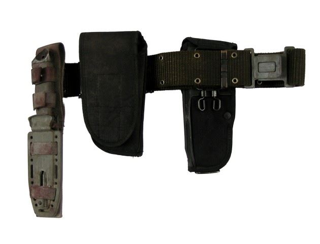 Green military utility belt with two black pouches for incidentals and a and grey sheath for 'Gerber' black combat knife with grey hilt, worn by Ben Mason's (Connor Jessup) body double. This is a real knife with a metal blade.